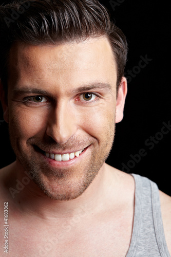 Close-up portrait of a man with intense gaze and subtle smile in low-key lighting