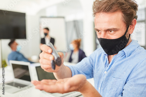 Geschäftsmann mit Mundschutz beim Hände desinfizieren