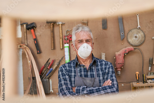 Zufriedener Senior im Rollstuhl betreut vom Sohn