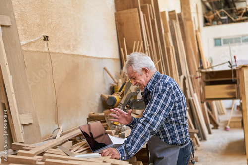 Handwerker Frau in Werkstatt mit Tablet Computer