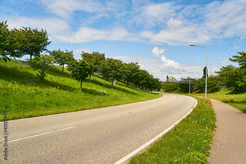 Leere Straße mit Kurve und Bürgersteig im Sommer