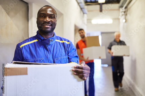 Afrikanischer Arbeiter und Kollegen tragen Kartons