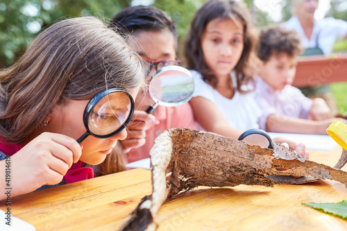 Kinder betrachten Baumrinde durch eine Lupe