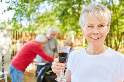 Elderly woman with glass of wine at a garden party
