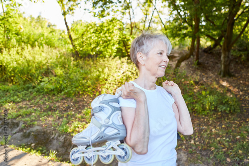 Senior Frau führt ein Telefonat im Sommer im Garten