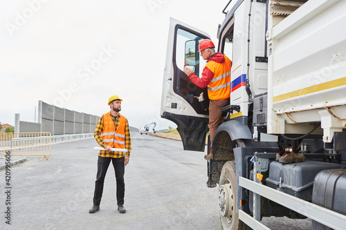 Arbeiter kontrolliert LKW Fahrer mit einer Lieferung
