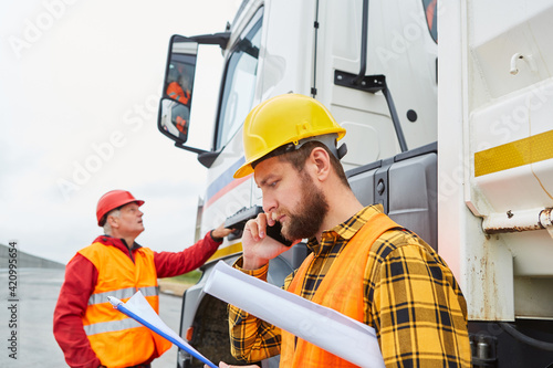 Bauarbeiter mit Handy und Checkliste kontrollieren LKW