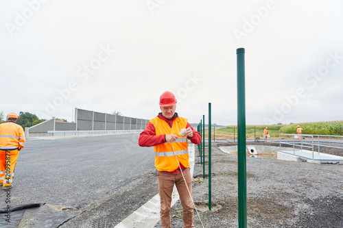 Bauarbeiter mit Richtschnur bei der Zaun Konstruktion
