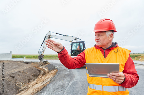 Bauleiter mit Tablet Computer bei der Bauplanung