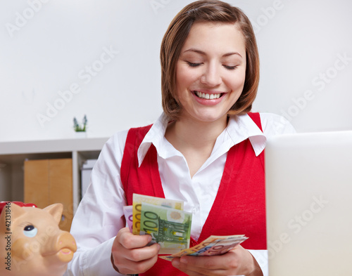 Seniorin im Büro mit Sparschwein und Geldscheinen