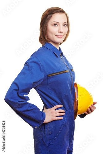 Lachende Bauarbeiterin mit Schraubenschlüssel