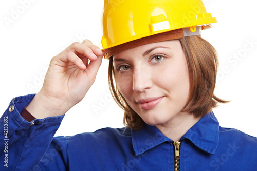 Frau im Blaumann mit Helm