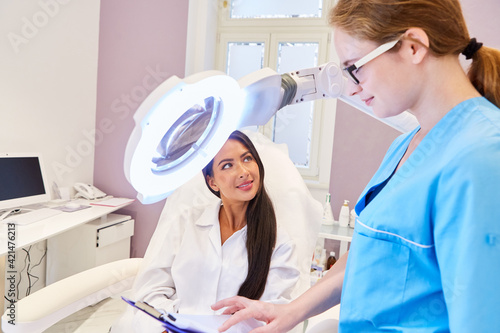 Ärzteteam bespricht Patientenakte in Hautarztpraxis