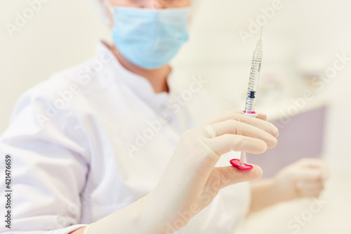Dermatologist holds a syringe with hyaluronic acid