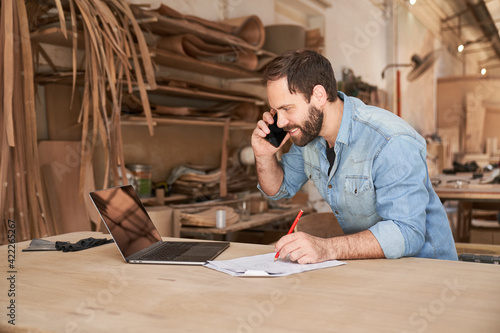 Handwerker Frau in Werkstatt mit Tablet Computer