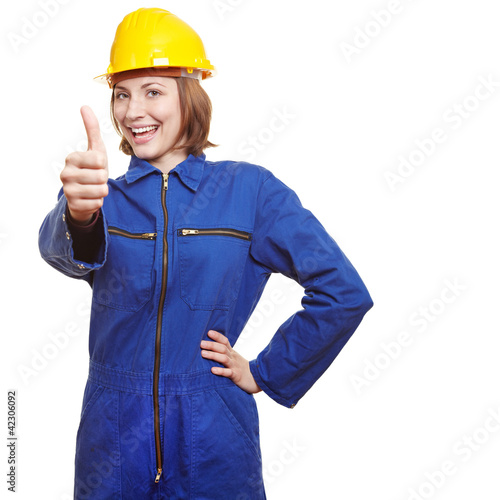 Handwerkerin hält Daumen hoch