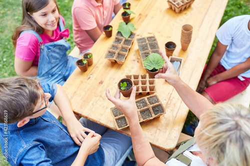 Group of children with seedlings learn botany
