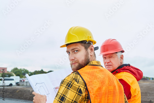 Zwei Bauarbeiter schauen auf eine Bauzeichnung