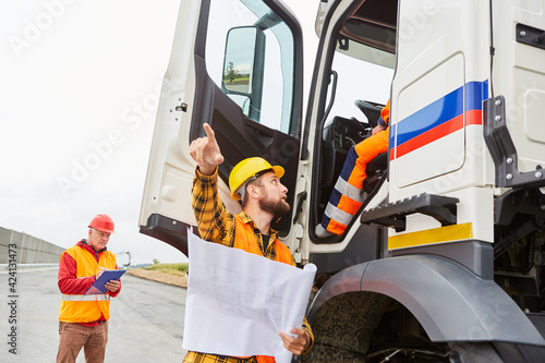 Bauleiter an LKW mit Checkliste gibt Richtung vor
