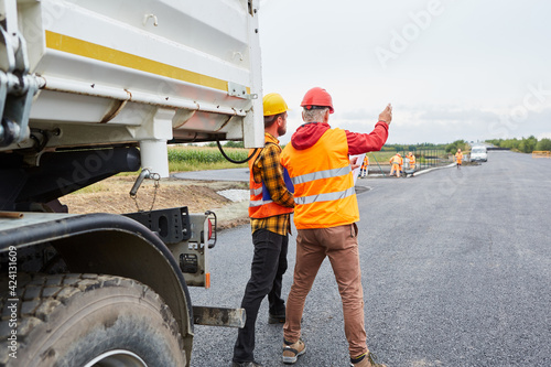 Bauleiter und Vorarbeiter mit Bauzeichnung auf Baustelle