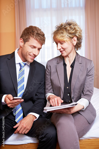 Geschäftsmann neben Businessfrau zeigt auf Zeitung
