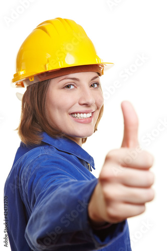 Lachende Bauarbeiterin mit Schraubenschlüssel