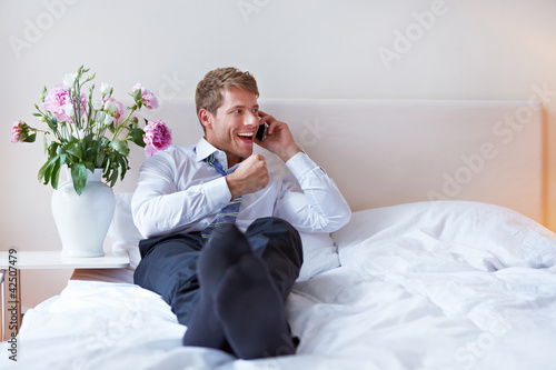 Manager mit Smartphone im Bett
