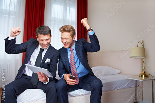 Zwei Geschäftsleute mit Tablet Computer jubeln