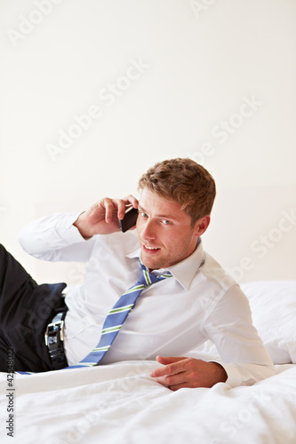Geschäftsmann im Bett telefoniert