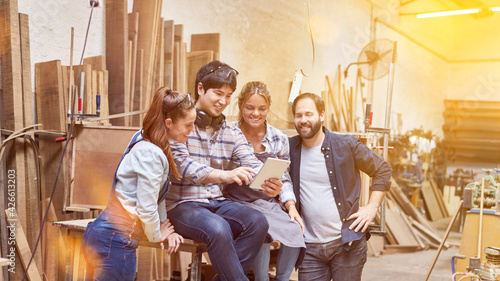 Handwerker Frau in Werkstatt mit Tablet Computer