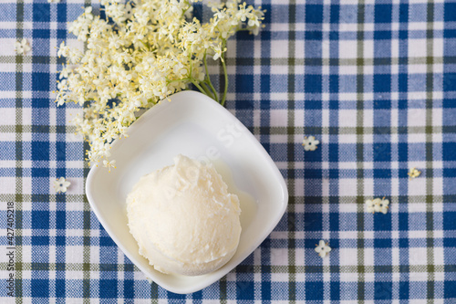 Kugel Holunderblüteneis mit frischen Holunderblüten