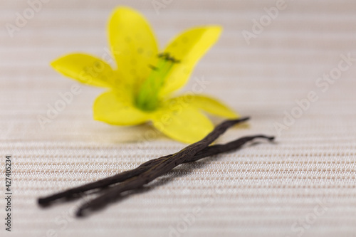 Vanilla pods with blossom of the vanilla plant as a vanilla concept