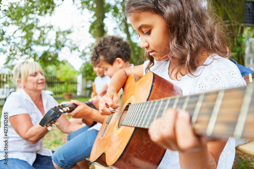 Gruppe Kinder lernt Gitarre spielen im Sommercamp