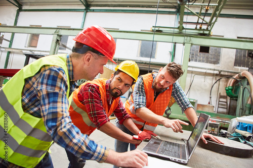 Arbeiter Team diskutiert Auftrag am Laptop Computer