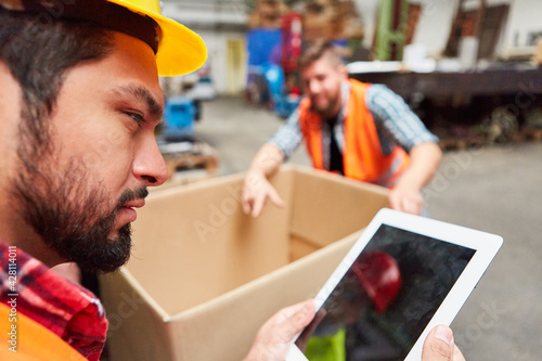 Kommissionierer prüft Wareneingang am Tablet Computer