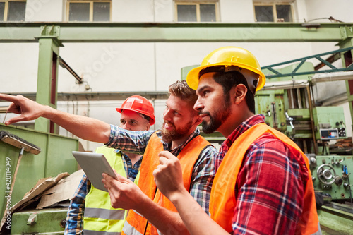 Group of workers in factory with order on tablet computer