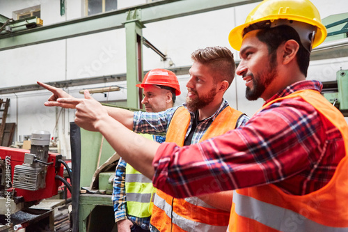 Gruppe Arbeiter besprechen ein Projekt in der Metallfabrik