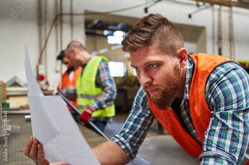 Arbeiter liest Zettel mit einer Bestellung in der Werkstatt