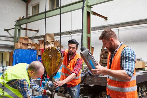 Team in der Fabrikhalle befestigt Last an Kranhaken