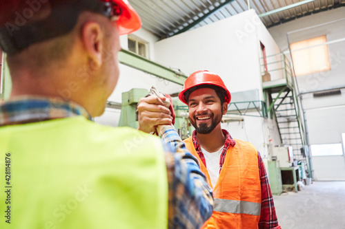 Zwei Arbeiter begrüßen sich mit High Five in Fabrik