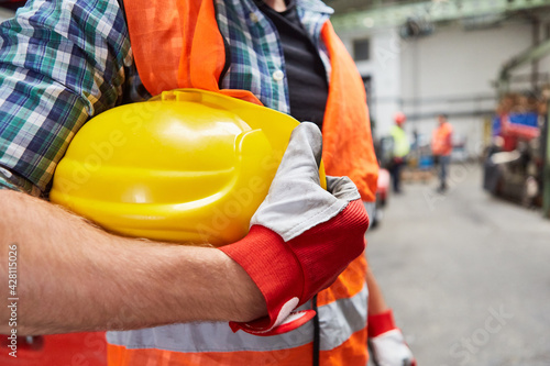 Arbeiter oder Handwerker mit Schutzhelm in Fabrik Halle