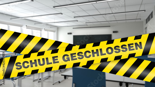 Schule geschlossen Absperrband vor leerem Klassenraum