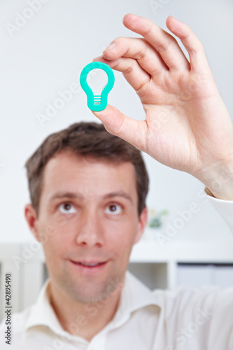 Mann hält Glühbirne über Kopf
