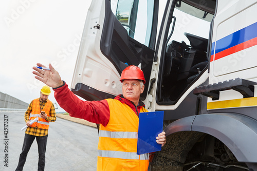Bauleiter an LKW mit Checkliste gibt Richtung vor