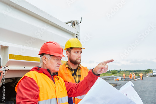 Arbeiter mit Bauzeichnung vor einem LKW