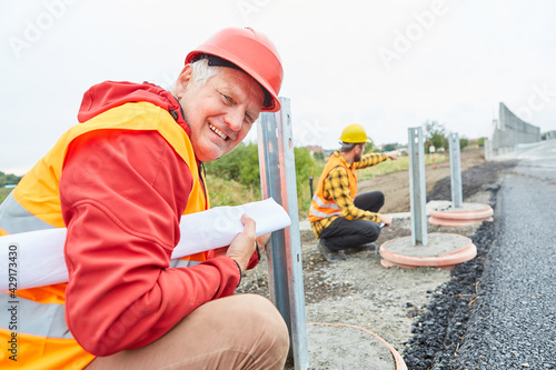 Bauarbeiter bei Kontrolle der Leitplanken Konstruktion