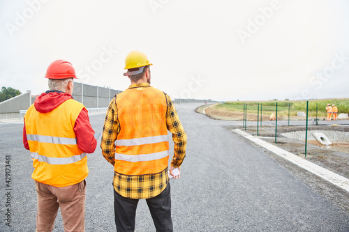 Zwei Bauarbeiter besprechen Ausbau der Straße