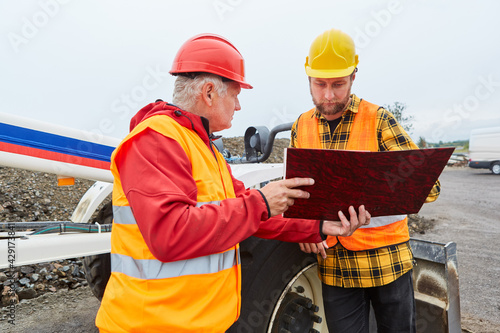 Bauleiter und Vorarbeiter mit Bauzeichnung auf Baustelle