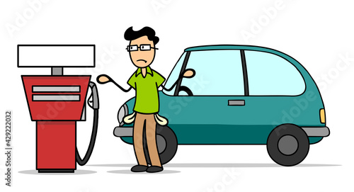 Cartoon Autofahrer mit Auto beim Tanken an Tankstelle