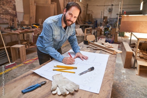 Start-Up Gründer mit Bauzeichnung in Tischlerei